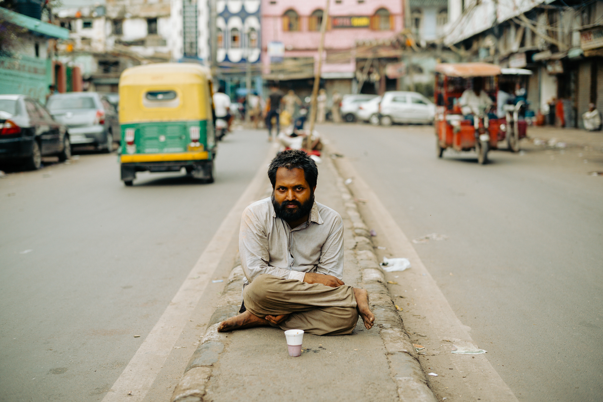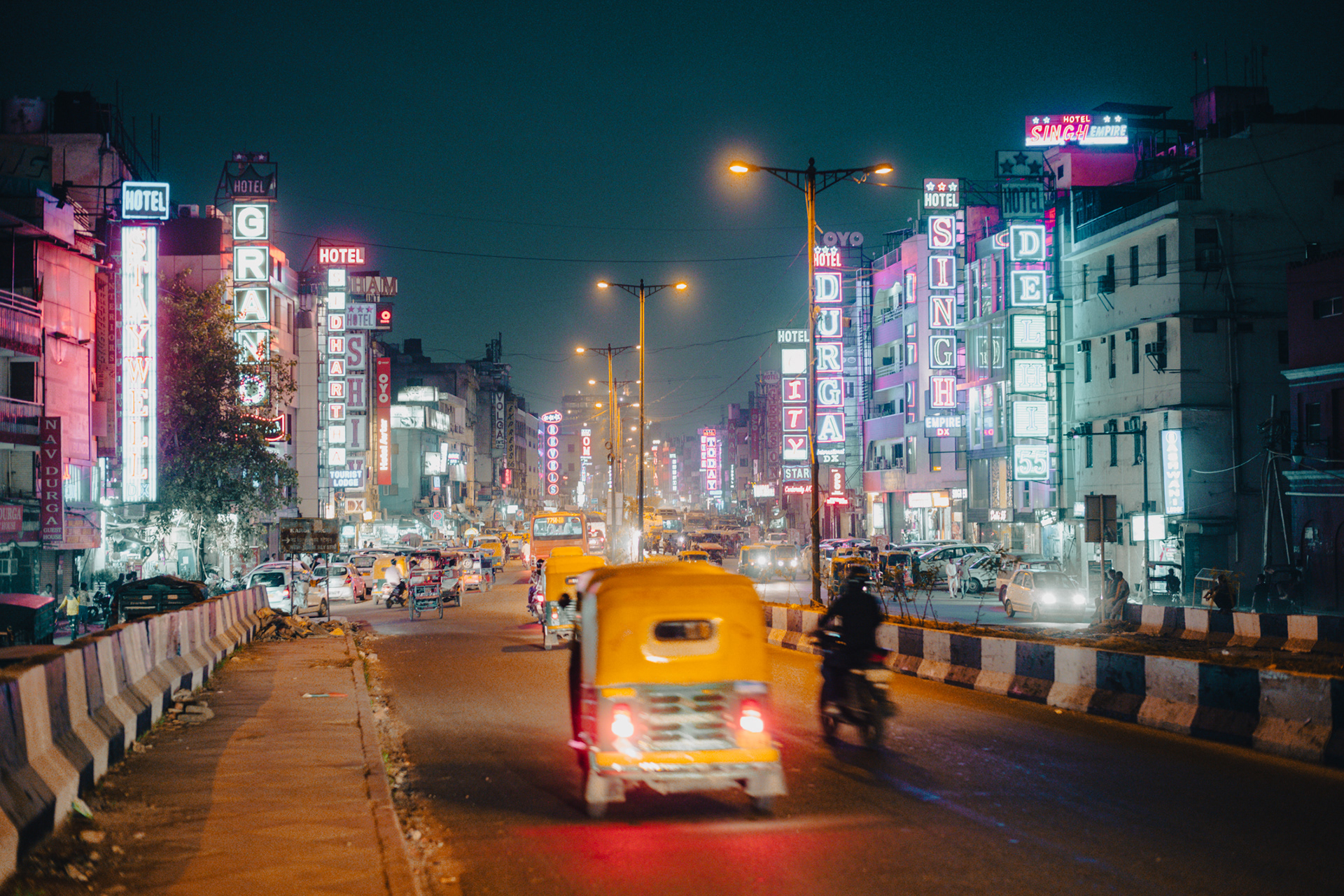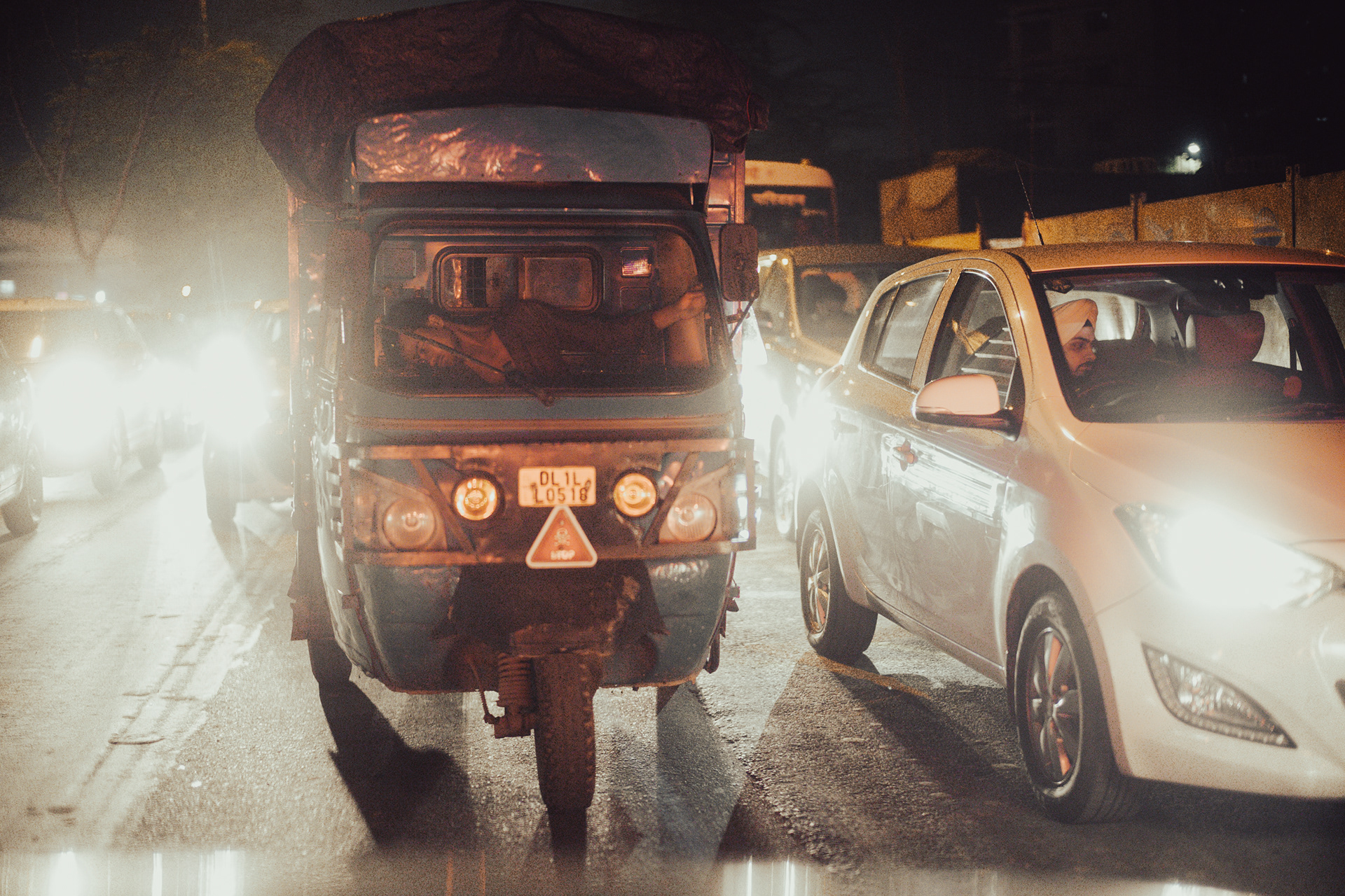 空港からホテルへ向かう道路は大渋滞。あちらこちらでクラクションが鳴り響く。運転手は「いつものことだよ」と、僕に気を使ってか、あまりクラクションを鳴らさなかった。信号待ちで止まった時、「前においでよ」と、運転手が助手席をポンポンと叩く。デリー最初の夜。旅の始まり。